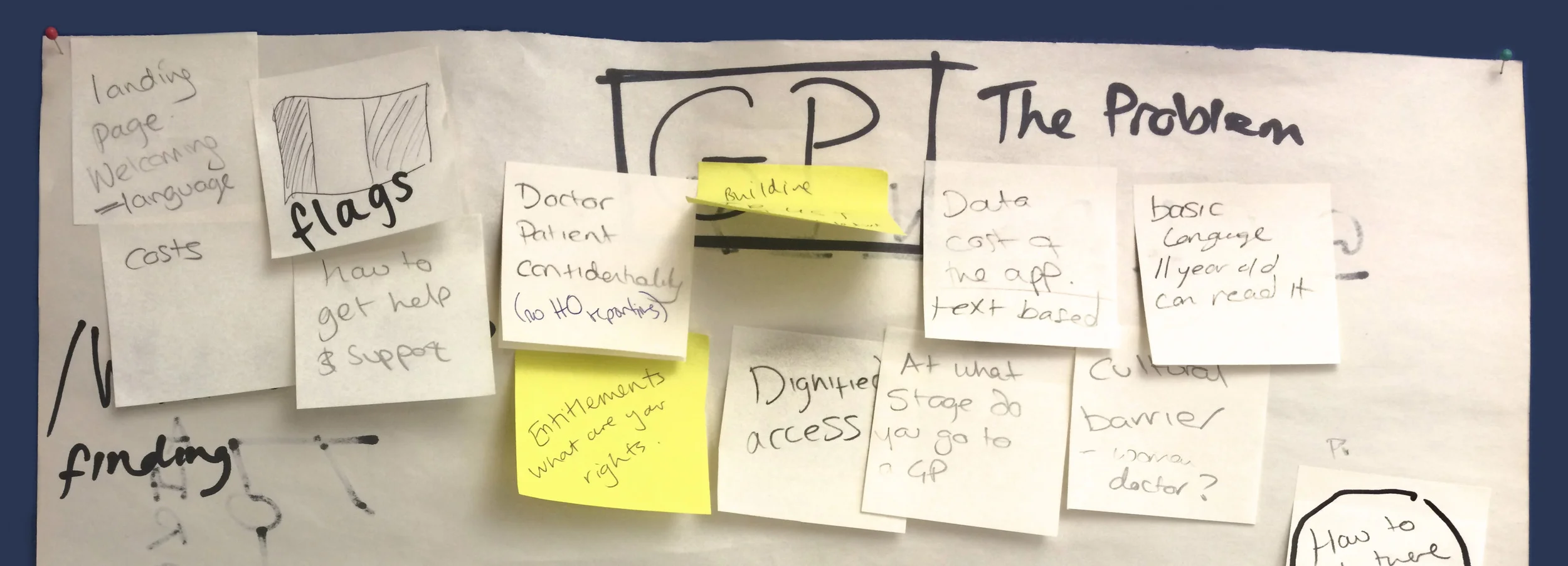 From this we leant many insights straight from a user's perspective, starting with the struggles of language barriers and not knowing what a GP was, or the NHS. Being asked to register with a GP, yet not being told what that meant can lead to unnecessary anxiety, at a time when stress from the situation people find themselves in can be a significant blocker to being able to register with the healthcare system.