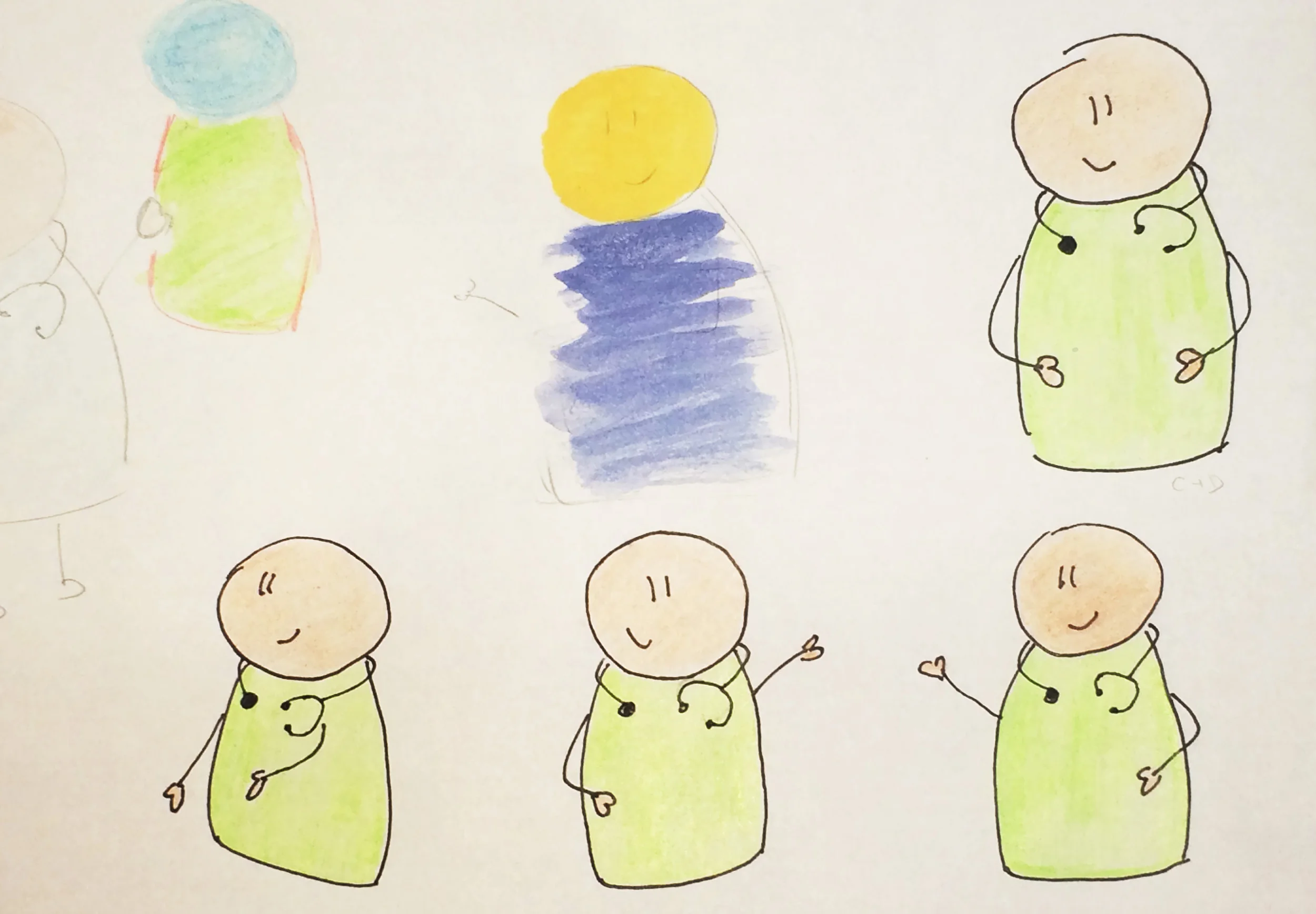 In the interim we came up with placeholder characters that could represent any culture and simply fit the community member, and a GP, with difference in clothes colour and stethoscope. These avatars would need to be tested extensively with users of all the different origins of migrants for cultural nuances and also for detail of characters.