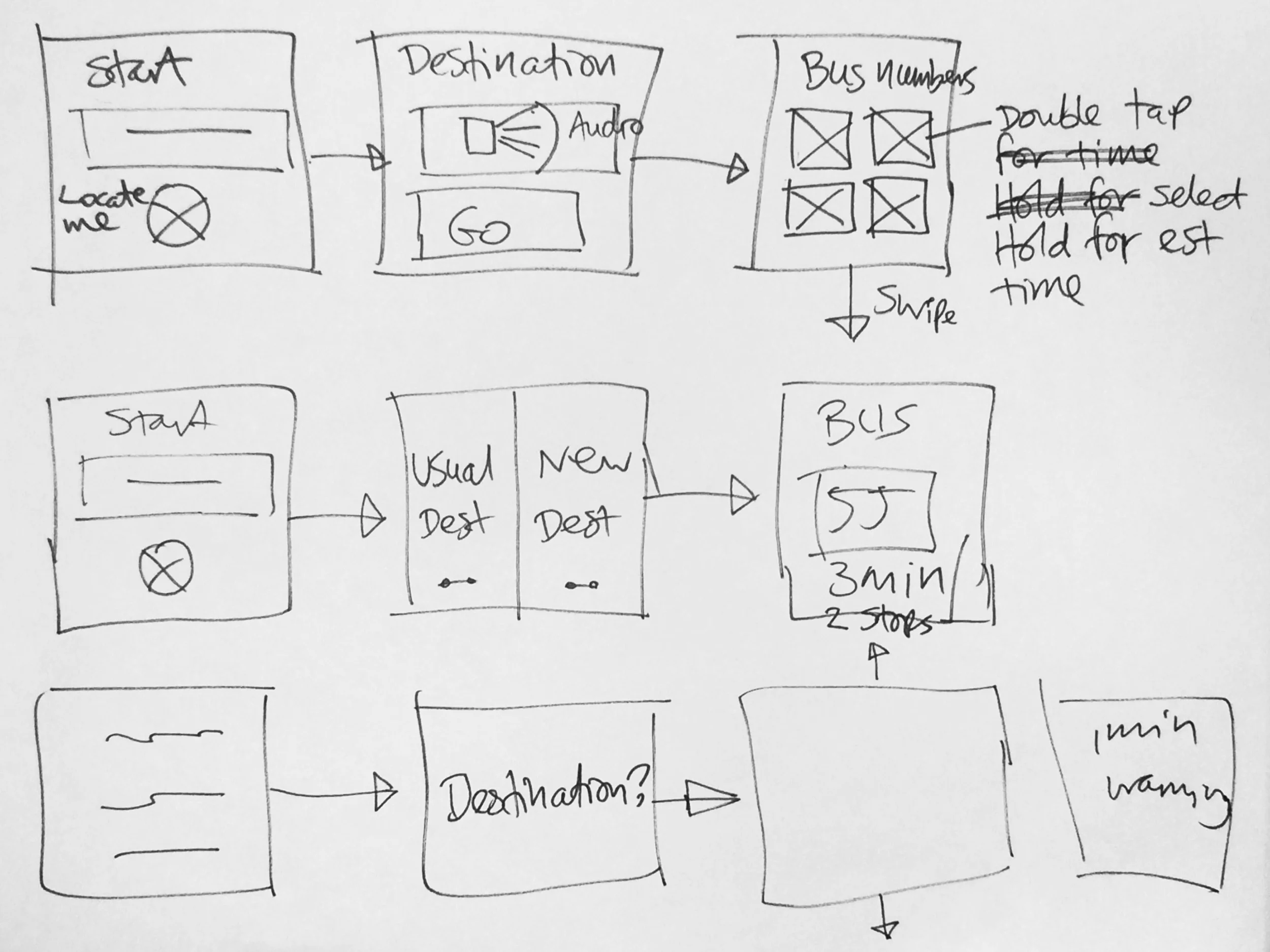 We ran a design studio with two UX Designers, one Visual Designer, one Developer, and one Engineer, bringing people together from every stage of the development process into a concentrated design session. We split the session into design for the on-boarding of location search, choosing a bus, with countdown notifications, getting on the bus, status notifications, and alerts to get off the bus.