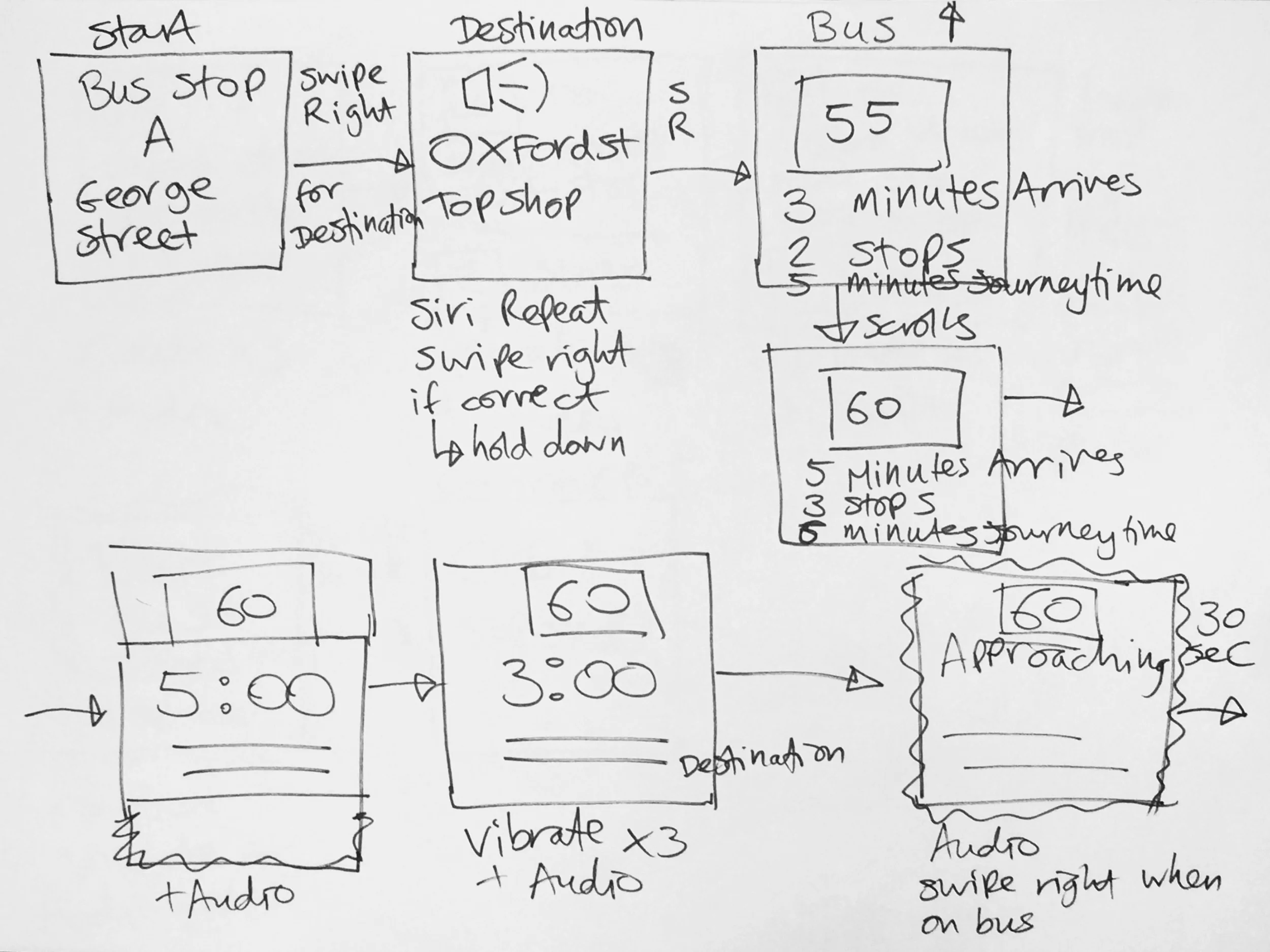 The second path joined the user at a bus stop, with them having already planned their journey and helping them overcome all the challenges they face whilst trying to locate the correct bus for them, know when it would arrive, and when the right time would be for them to get off. The two paths were voted on, with merits discussed as a group, before focussing on the bus journey as the place we could help the user the most with.