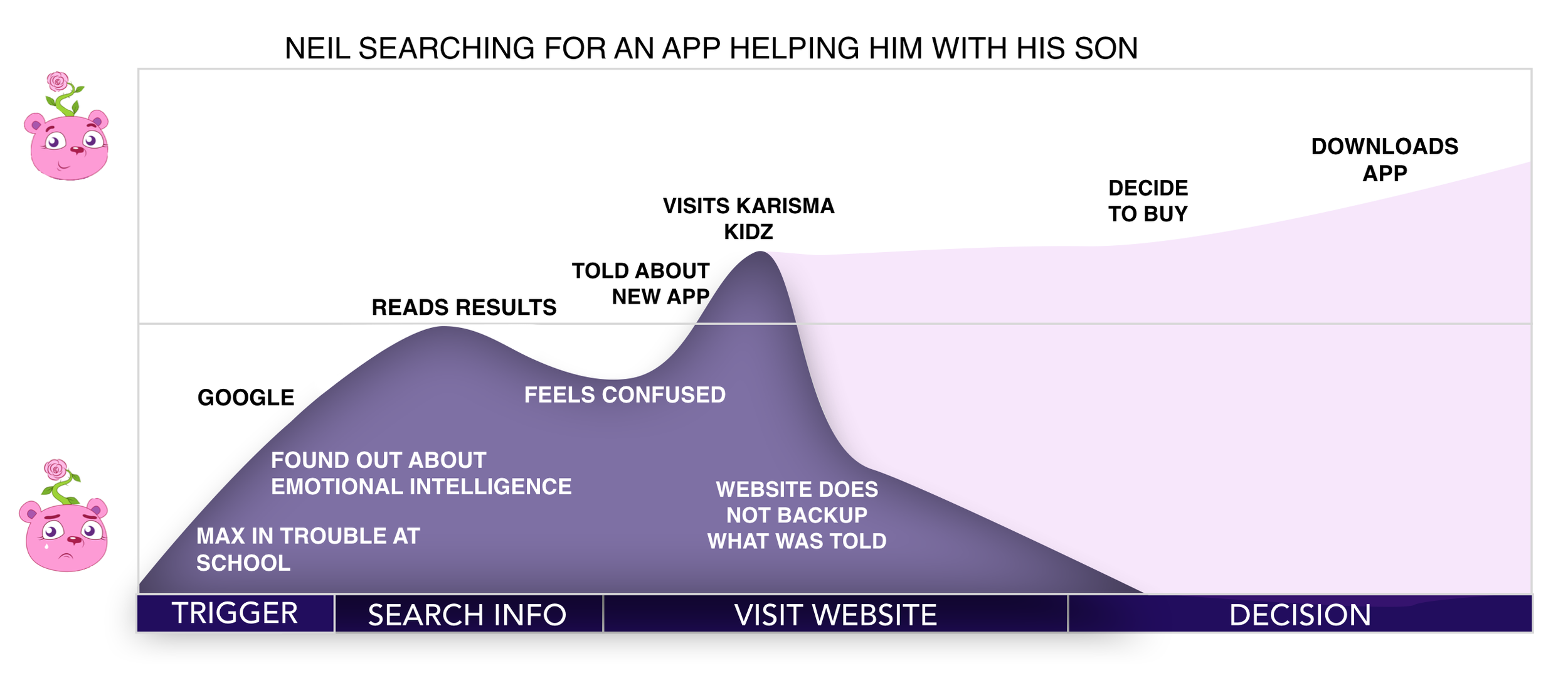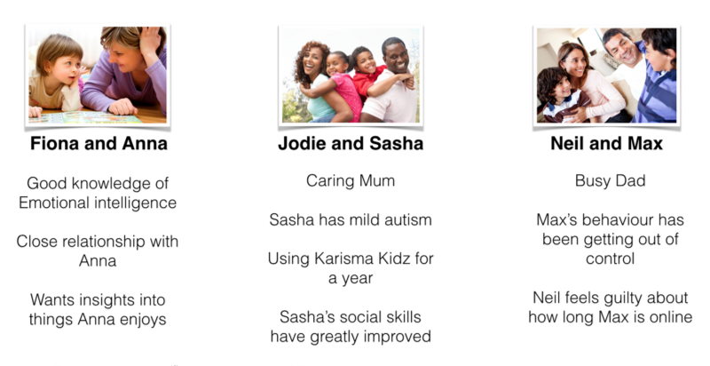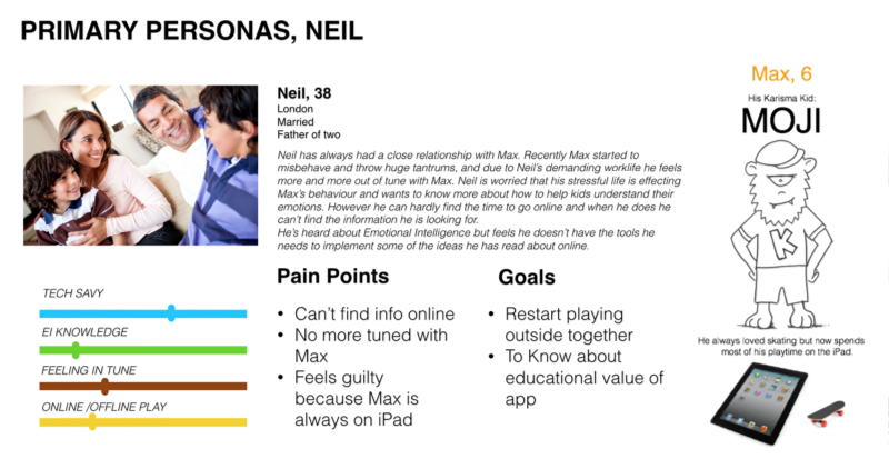 Of our three personas, Neil and his son Max were our parent and child persona, focussing on the core user groups for the app. This group comprises of parents who want their children's behaviour to improve through emotional learning within the app, and real-world shared tasks and activities with the family, outside of the app.