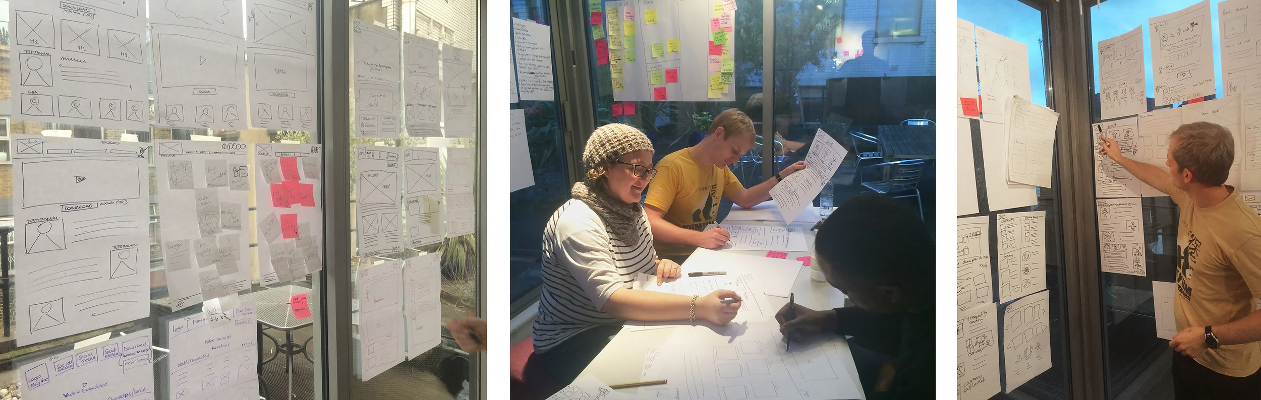 Before continuing with the other website pages, and after each session of each page, we did a ‘mash-up’, which is where all of your ideas have been presented and pinned up on the wall, and as a team, we worked out what the best elements of each design were to create one ‘master design’, from which we could then go and test with users.